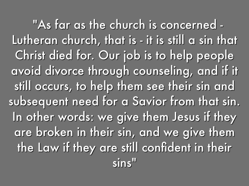 "As far as the church is concerned - Lutheran church, that is - it is still a sin that Christ died for. Our job is to help people avoid divorce through counseling, and if it still occurs, to help them see their sin and subsequent need for a Savior from that sin. In other words: we give them Jesus if they are broken in their sin, and we give them the Law if they are still confident in their sins"