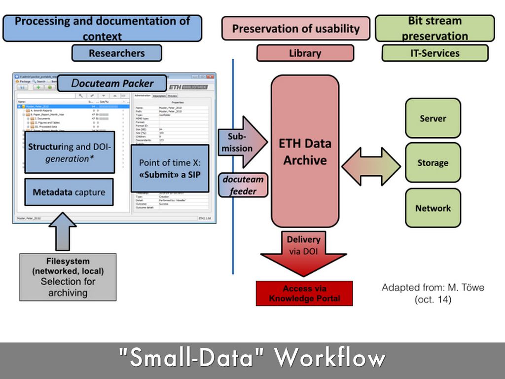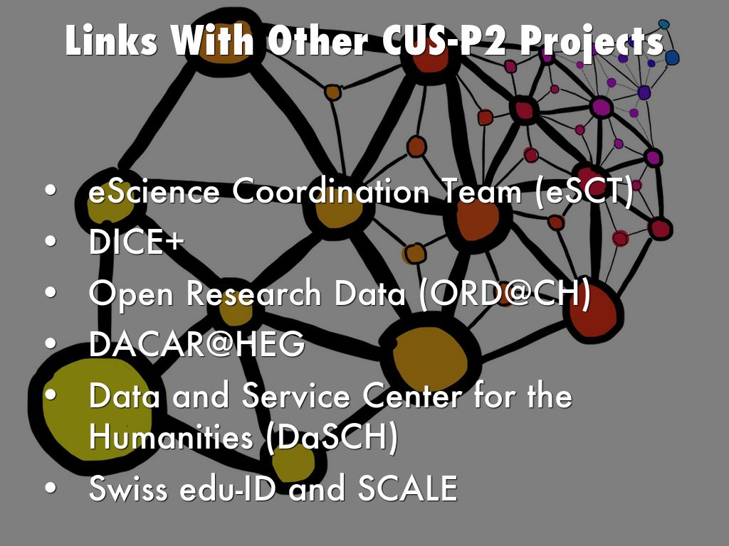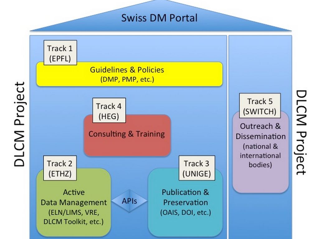 Digital curation and preservation of large and complex scientific objects: Data Life-Cycle Management - The Swiss Way. We target in the context of a national program (CUS-P2) the setting up of the the required services that will allow the efficient management of active research data, and ensure the publication, long-term reference and preservation of subsets of data selected by researchers. Through this project we intend to implement concrete high-impact use cases of exemplary research data life-cycle management solutions, along with guidelines and training, so that researchers and their supporting scientific IT and library teams can apply the results themselves in their daily data management activities.
