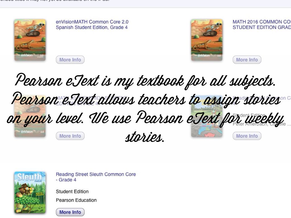 Pearson eText is my textbook for all subjects. Pearson eText allows teachers to assign stories on your level. We use Pearson eText for weekly stories.