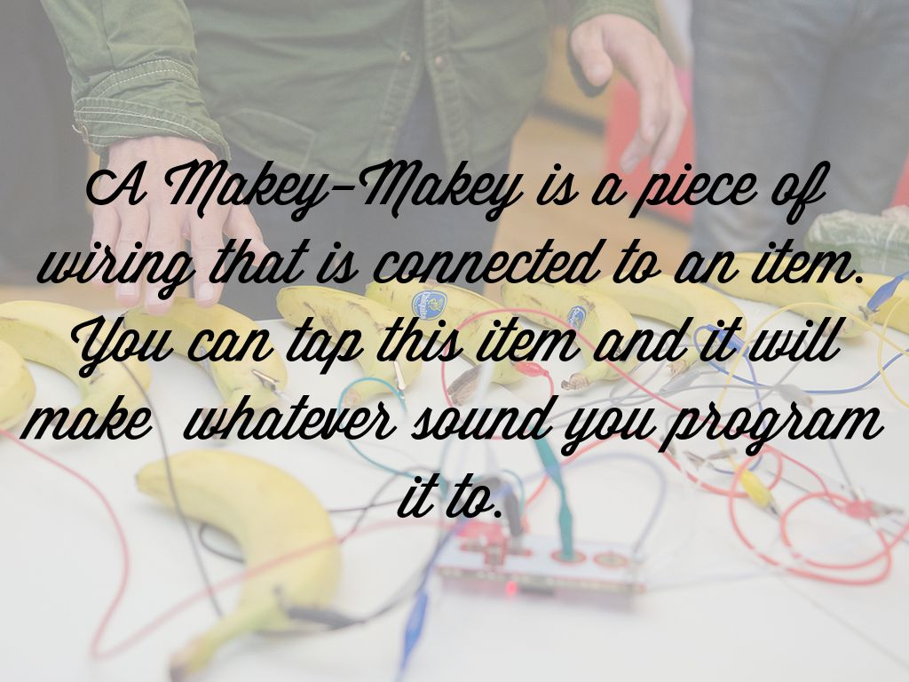 A Makey-Makey is a piece of wiring that is connected to an item. You can tap this item and it will make whatever sound you program it to.