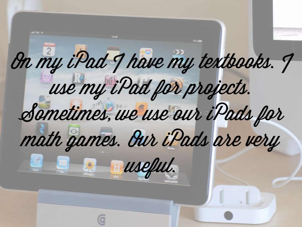 On my iPad I have my textbooks. I use my iPad for projects. Sometimes, we use our iPads for math games. Our iPads are very useful.