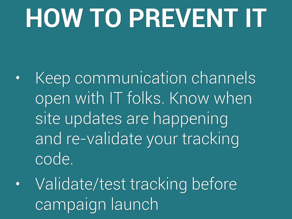 Keep communication channels open with IT folks. Know when site updates are happening and re-validate your tracking code.