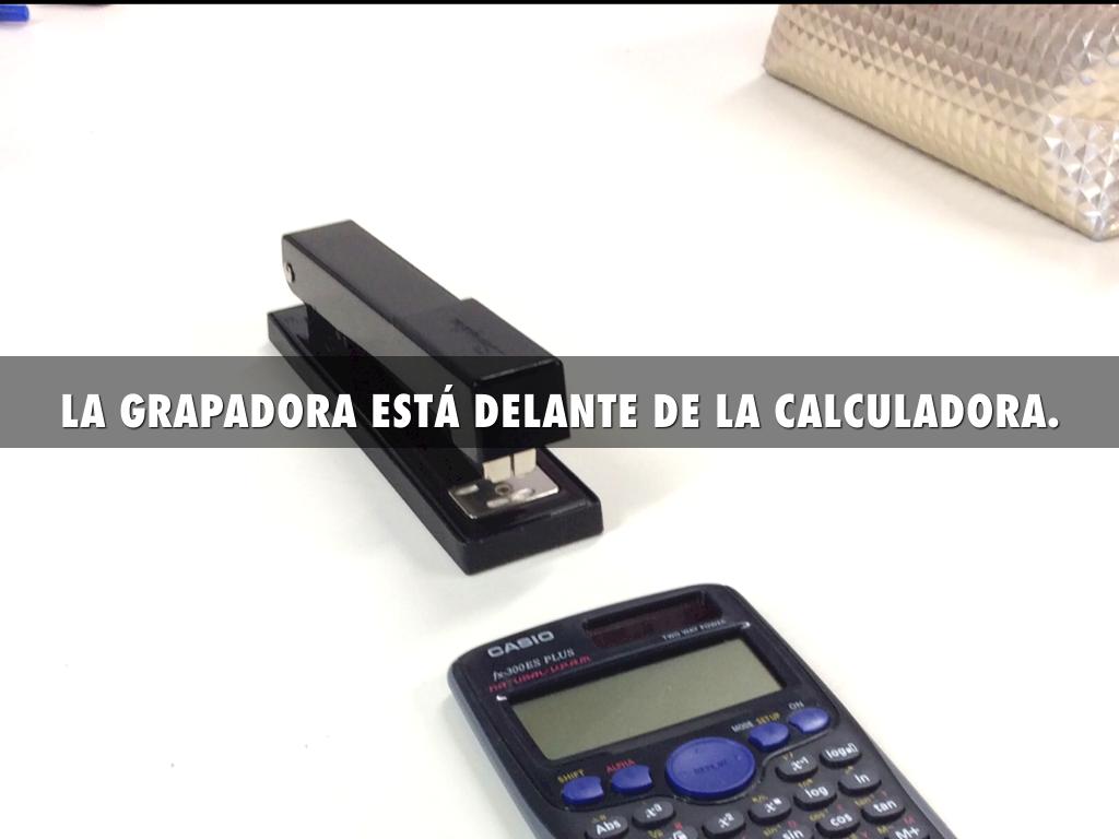 LA GRAPADORA ESTÁ DELANTE DE LA CALCULADORA.