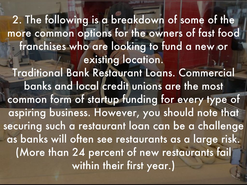2. The following is a breakdown of some of the more common options for the owners of fast food franchises who are looking to fund a new or existing location.