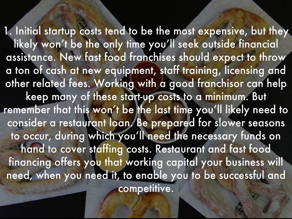 1. Initial startup costs tend to be the most expensive, but they likely won’t be the only time you’ll seek outside financial assistance. New fast food franchises should expect to throw a ton of cash at new equipment, staff training, licensing and other related fees. Working with a good franchisor can help keep many of these start-up costs to a minimum. But remember that this won’t be the last time you’ll likely need to consider a restaurant loan. Be prepared for slower seasons to occur, during which you’ll need the necessary funds on hand to cover staffing costs. Restaurant and fast food financing offers you that working capital your business will need, when you need it, to enable you to be successful and competitive.