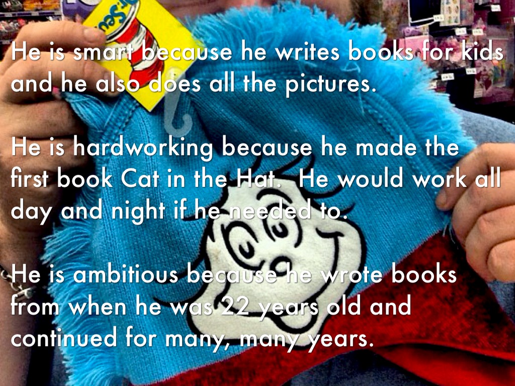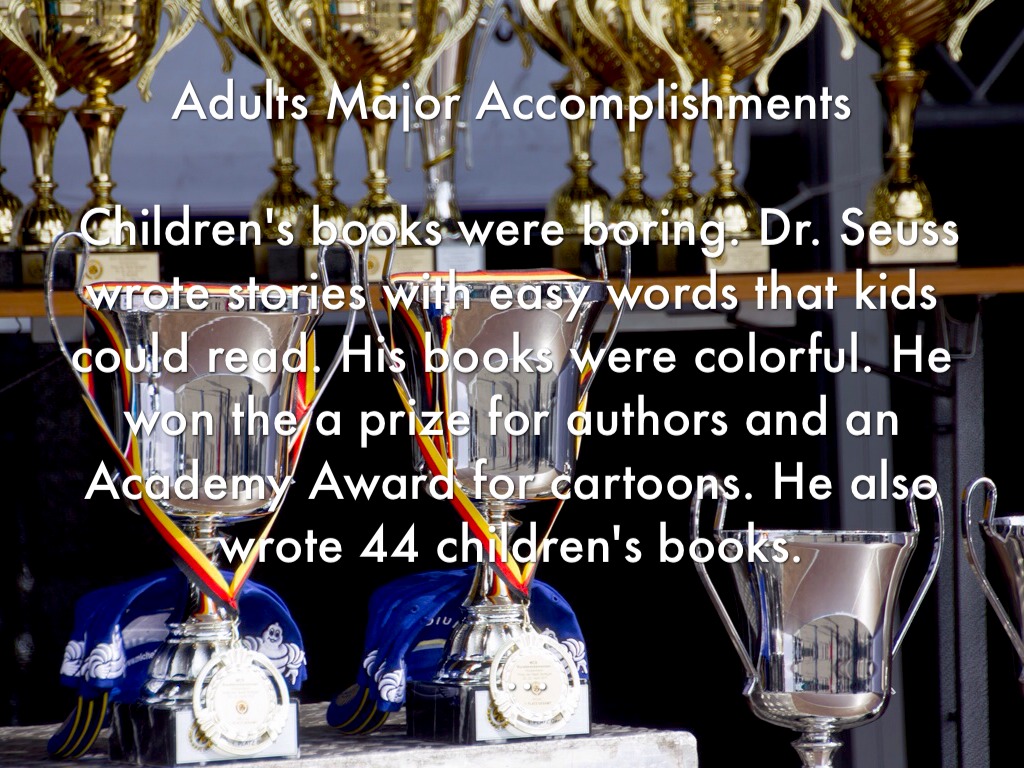 Children's books were boring. Dr. Seuss wrote stories with easy words that kids could read. His books were colorful. He won the a prize for authors and an Academy Award for cartoons. He also wrote 44 children's books.