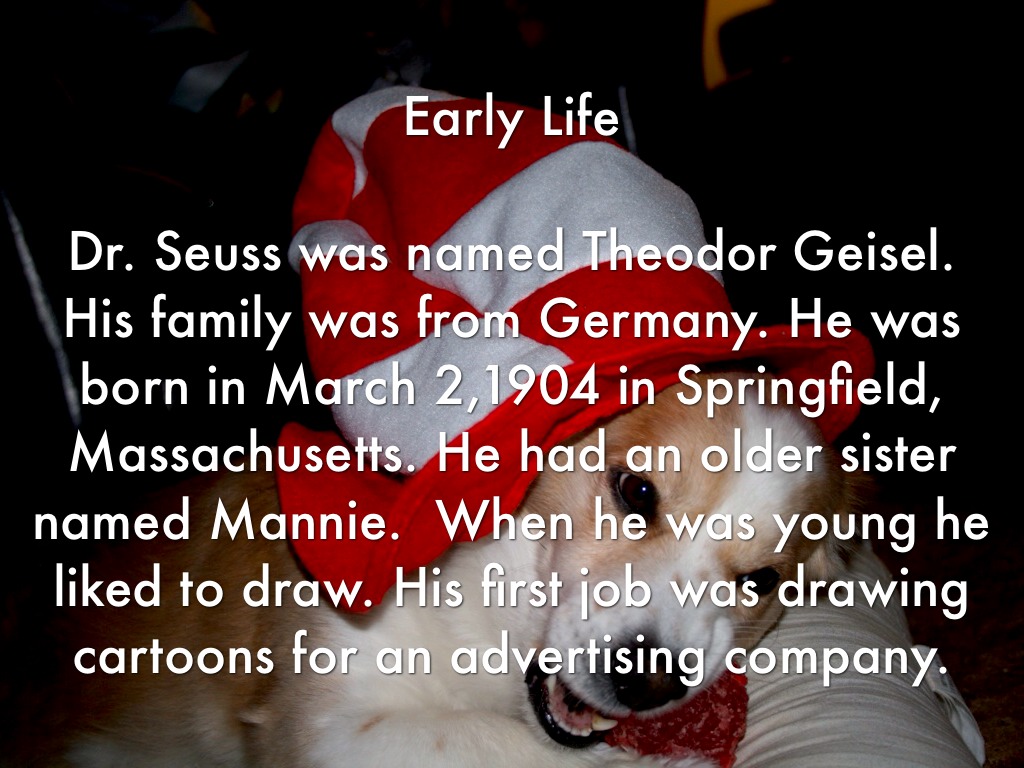 Dr. Seuss was named Theodor Geisel. His family was from Germany. He was born in March 2,1904 in Springfield, Massachusetts. He had an older sister named Mannie. When he was young he liked to draw. His first job was drawing cartoons for an advertising company.