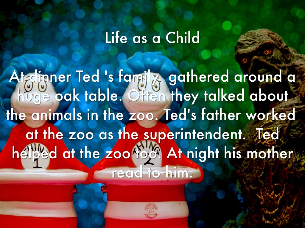 At dinner Ted 's family gathered around a huge oak table. Often they talked about the animals in the zoo. Ted's father worked at the zoo as the superintendent. Ted helped at the zoo too. At night his mother read to him.