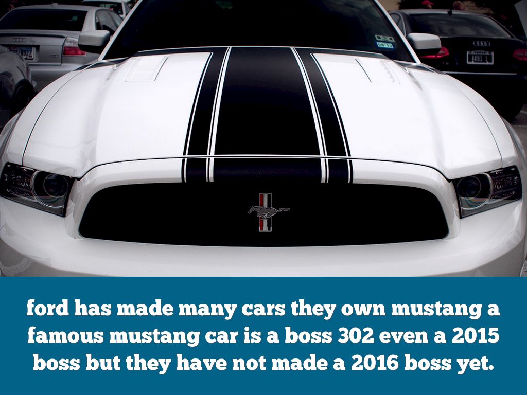 ford has made many cars they own mustang a famous mustang car is a boss 302 even a 2015 boss but they have not made a 2016 boss yet.