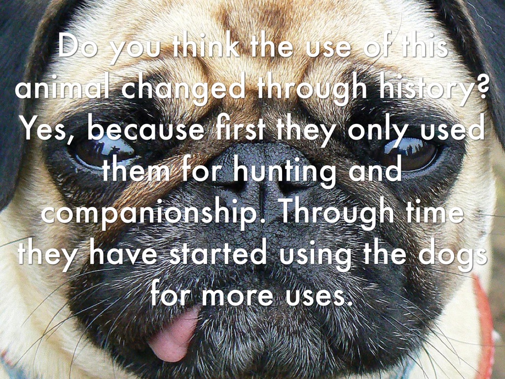 Do you think the use of this animal changed through history? Yes, because first they only used them for hunting and companionship. Through time they have started using the dogs for more uses.