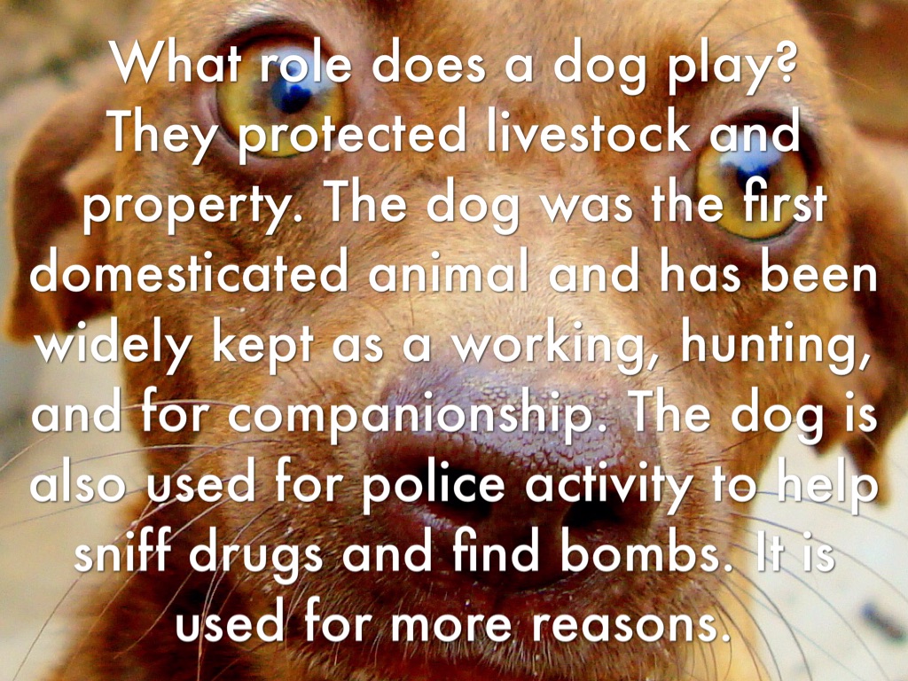 What role does a dog play? They protected livestock and property. The dog was the first domesticated animal and has been widely kept as a working, hunting, and for companionship. The dog is also used for police activity to help sniff drugs and find bombs. It is used for more reasons.