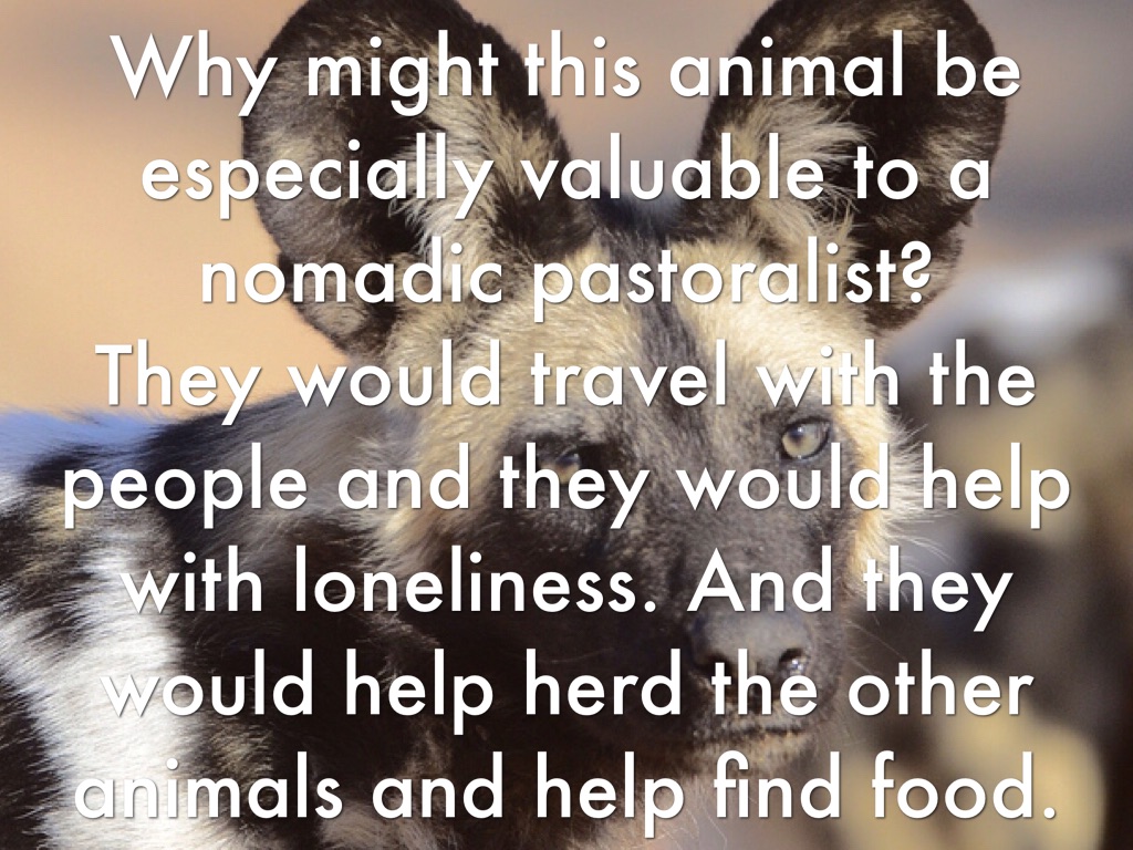 Why might this animal be especially valuable to a nomadic pastoralist? They would travel with the people and they would help with loneliness. And they would help herd the other animals and help find food.