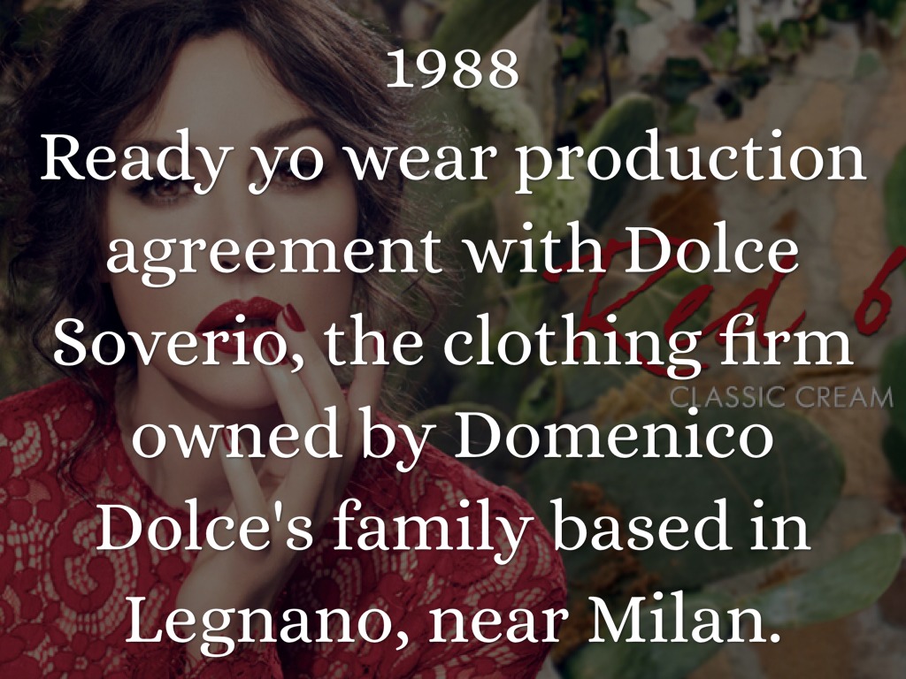 Ready yo wear production agreement with Dolce Soverio, the clothing firm owned by Domenico Dolce's family based in Legnano, near Milan.
