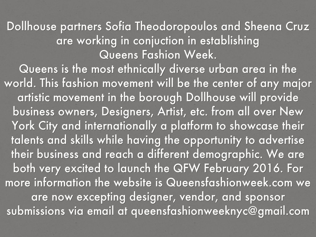 Queens is the most ethnically diverse urban area in the world. This fashion movement will be the center of any major artistic movement in the borough Dollhouse will provide business owners, Designers, Artist, etc. from all over New York City and internationally a platform to showcase their talents and skills while having the opportunity to advertise their business and reach a different demographic. We are both very excited to launch the QFW February 2016. For more information the website is Queensfashionweek.com we are now excepting designer, vendor, and sponsor submissions via email at queensfashionweeknyc@gmail.com