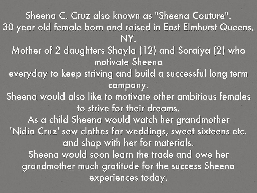 Sheena would soon learn the trade and owe her grandmother much gratitude for the success Sheena experiences today.