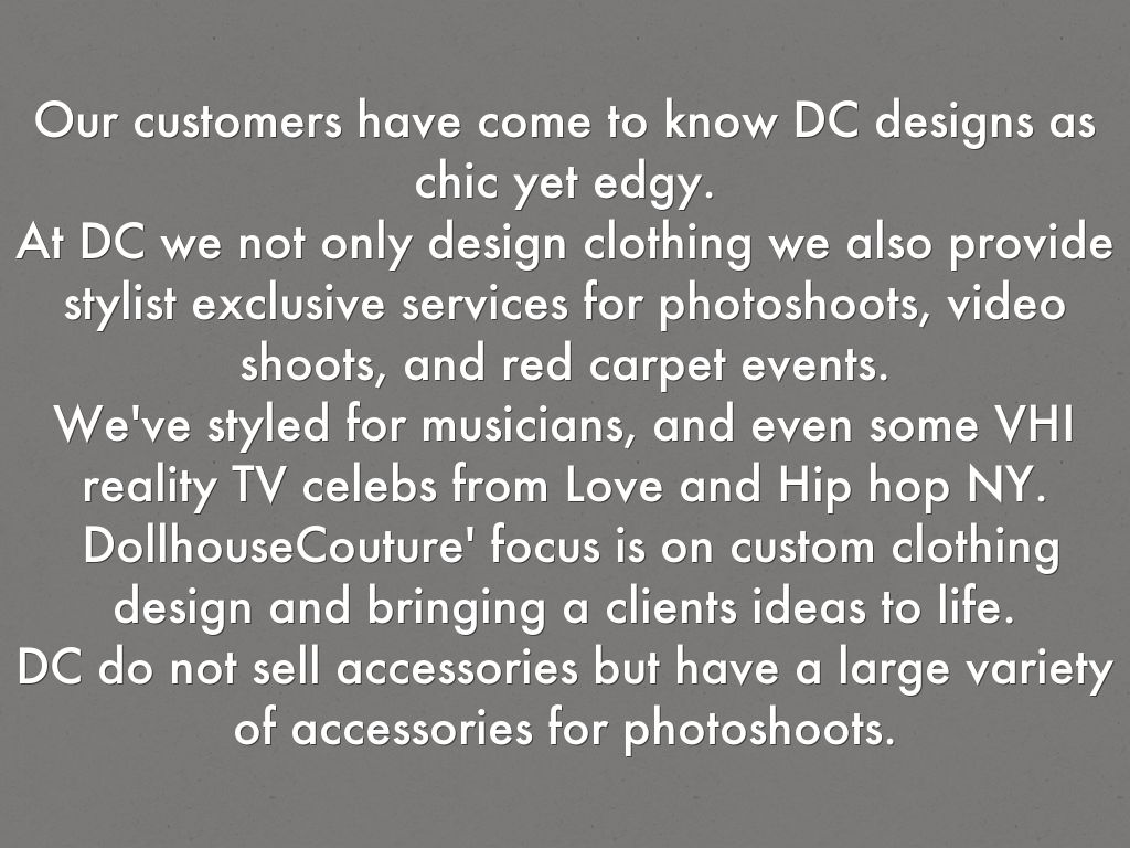 At DC we not only design clothing we also provide stylist exclusive services for photoshoots, video shoots, and red carpet events.
