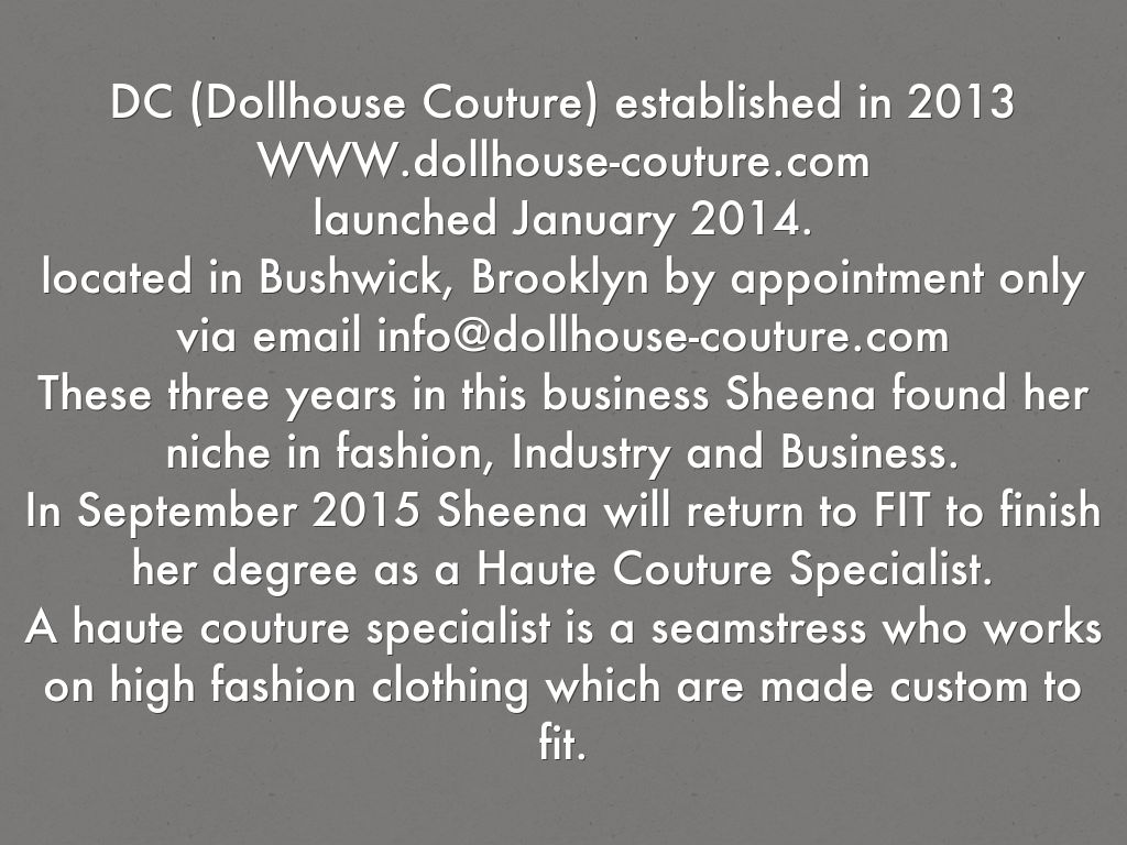 In September 2015 Sheena will return to FIT to finish her degree as a Haute Couture Specialist.