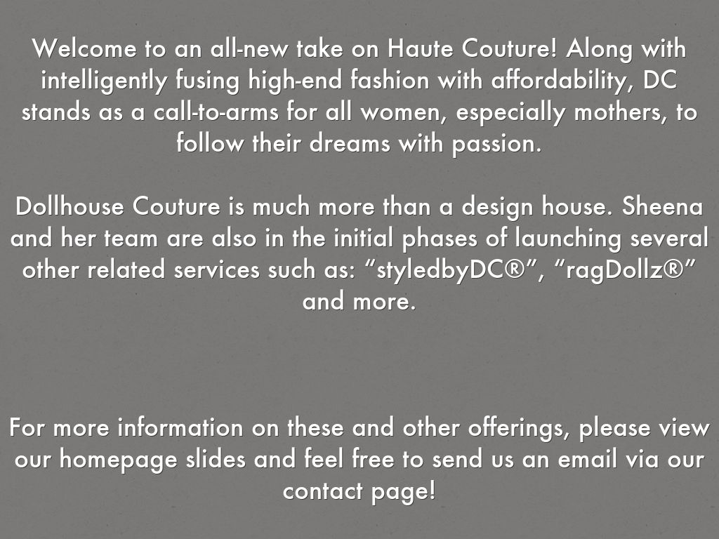 Dollhouse Couture is much more than a design house. Sheena and her team are also in the initial phases of launching several other related services such as: “styledbyDC®”, “ragDollz®” and more.