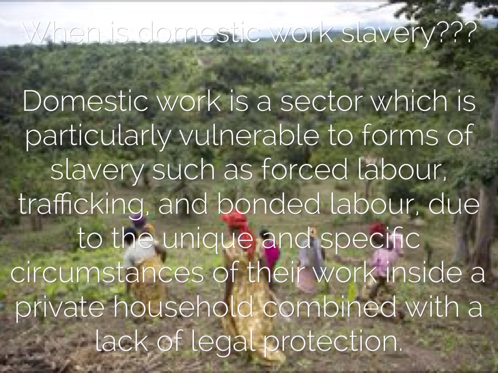 Domestic work is a sector which is particularly vulnerable to forms of slavery such as forced labour, trafficking, and bonded labour, due to the unique and specific circumstances of their work inside a private household combined with a lack of legal protection.
