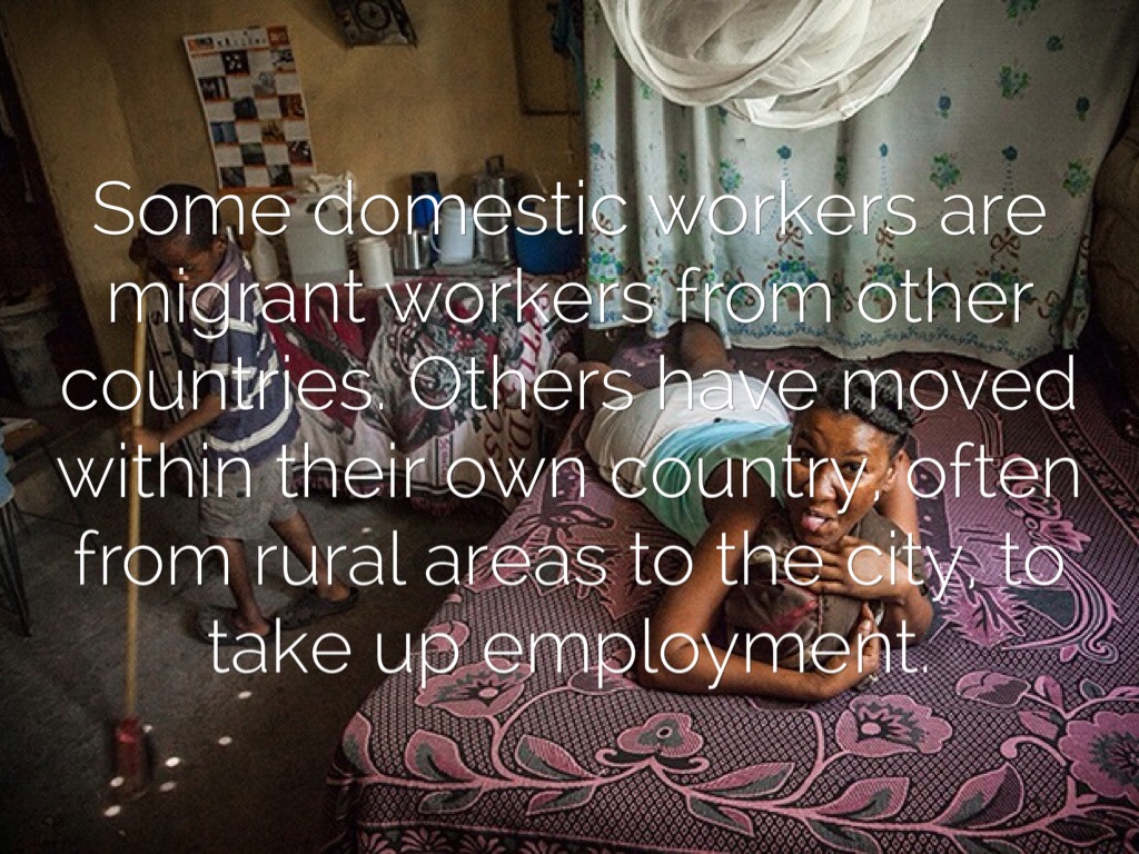 Some domestic workers are migrant workers from other countries. Others have moved within their own country, often from rural areas to the city, to take up employment.