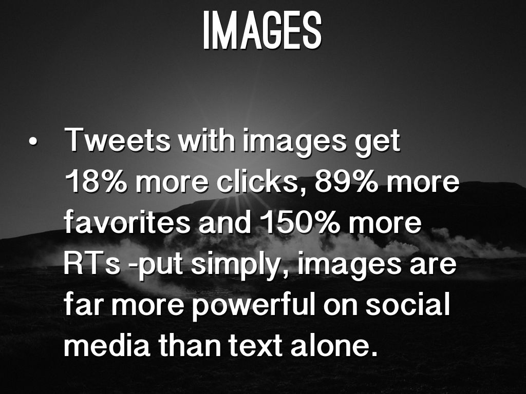 Tweets with images get 18% more clicks, 89% more favorites and 150% more RTs -put simply, images are far more powerful on social media than text alone.