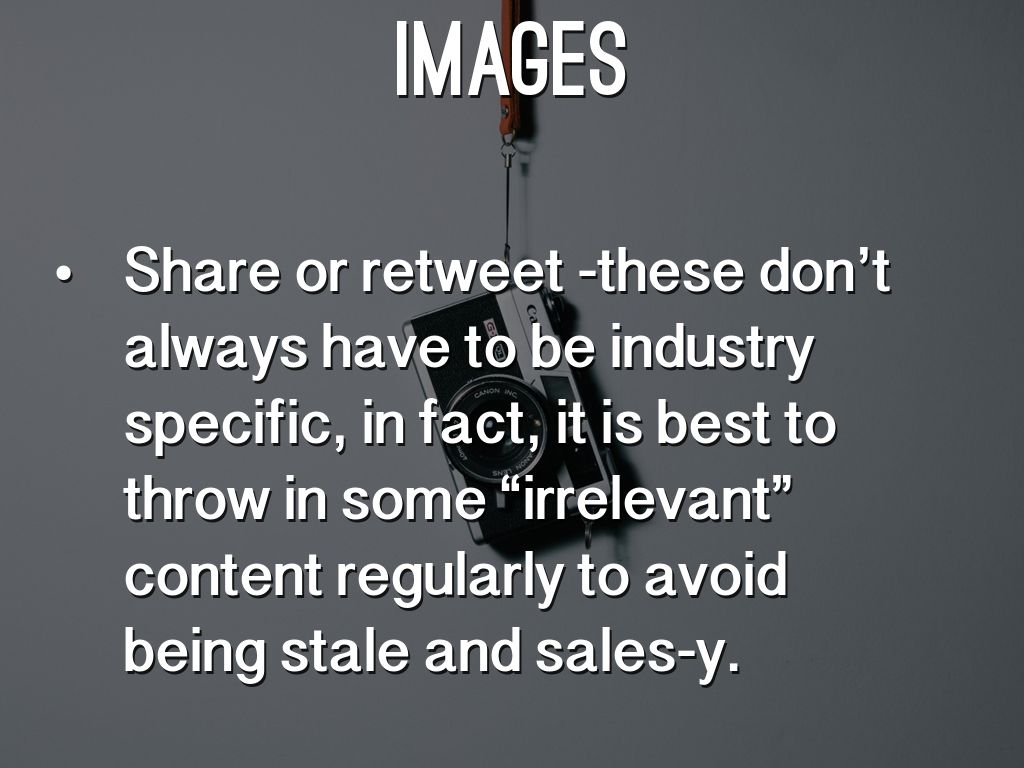 Share or retweet -these don’t always have to be industry specific, in fact, it is best to throw in some “irrelevant” content regularly to avoid being stale and sales-y.