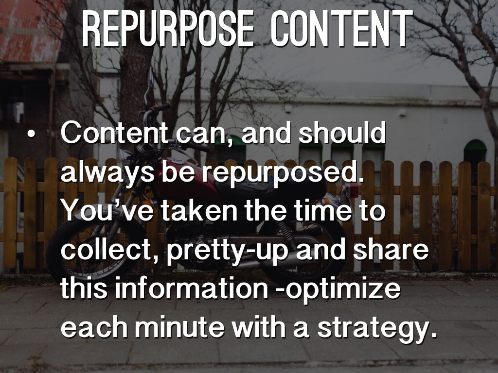 Content can, and should always be repurposed. You’ve taken the time to collect, pretty-up and share this information -optimize each minute with a strategy.