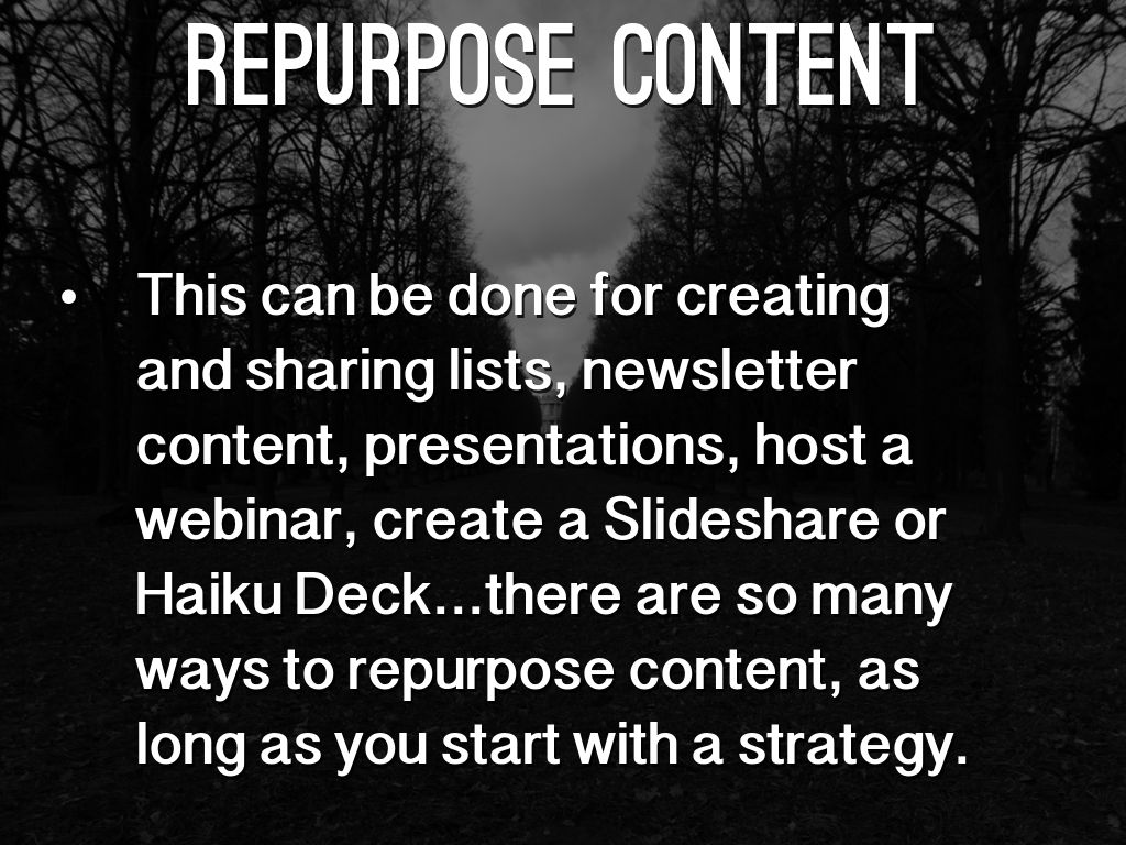 This can be done for creating and sharing lists, newsletter content, presentations, host a webinar, create a Slideshare or Haiku Deck...there are so many ways to repurpose content, as long as you start with a strategy.