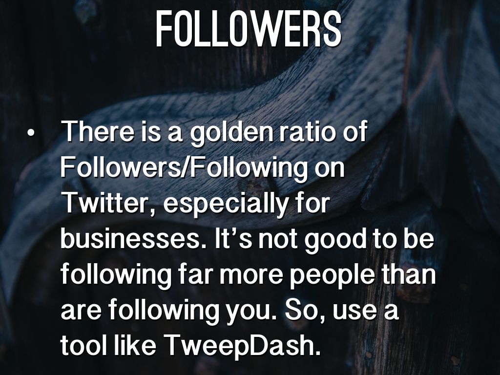 There is a golden ratio of Followers/Following on Twitter, especially for businesses. It’s not good to be following far more people than are following you. So, use a tool like TweepDash.