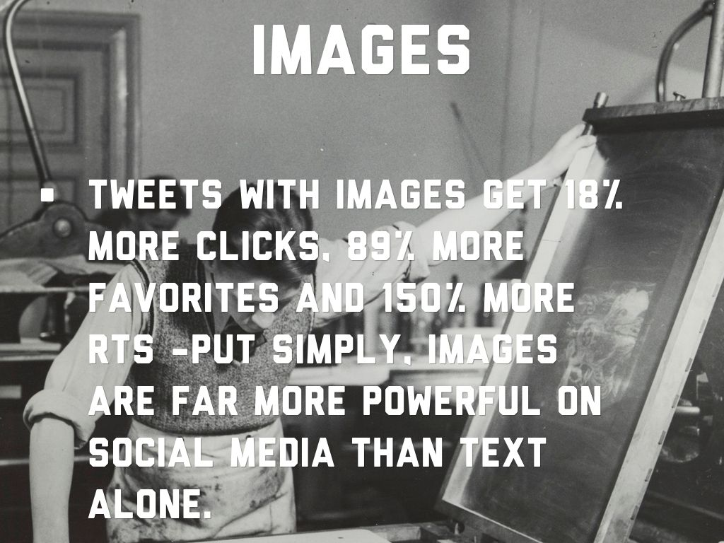 Tweets with images get 18% more clicks, 89% more favorites and 150% more RTs -put simply, images are far more powerful on social media than text alone.