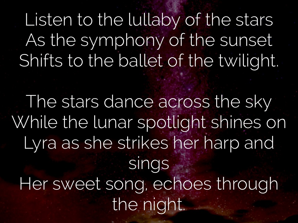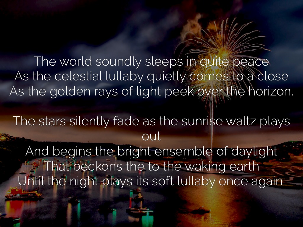 The stars silently fade as the sunrise waltz plays out And begins the bright ensemble of daylight That beckons the to the waking earth Until the night plays its soft lullaby once again.