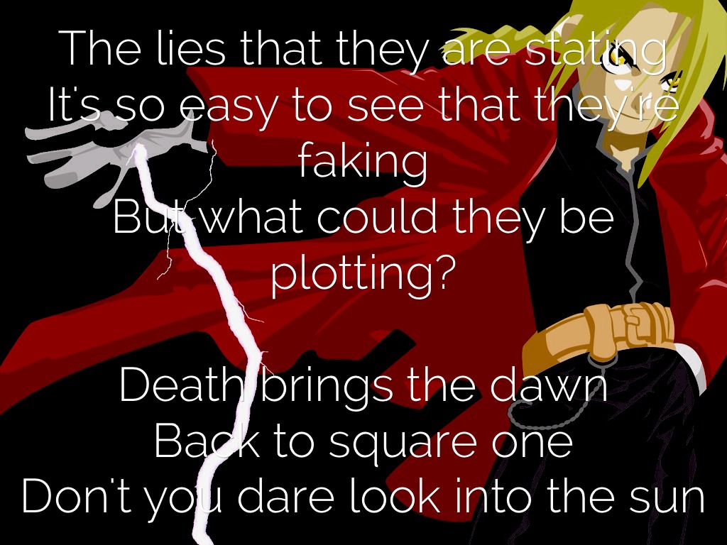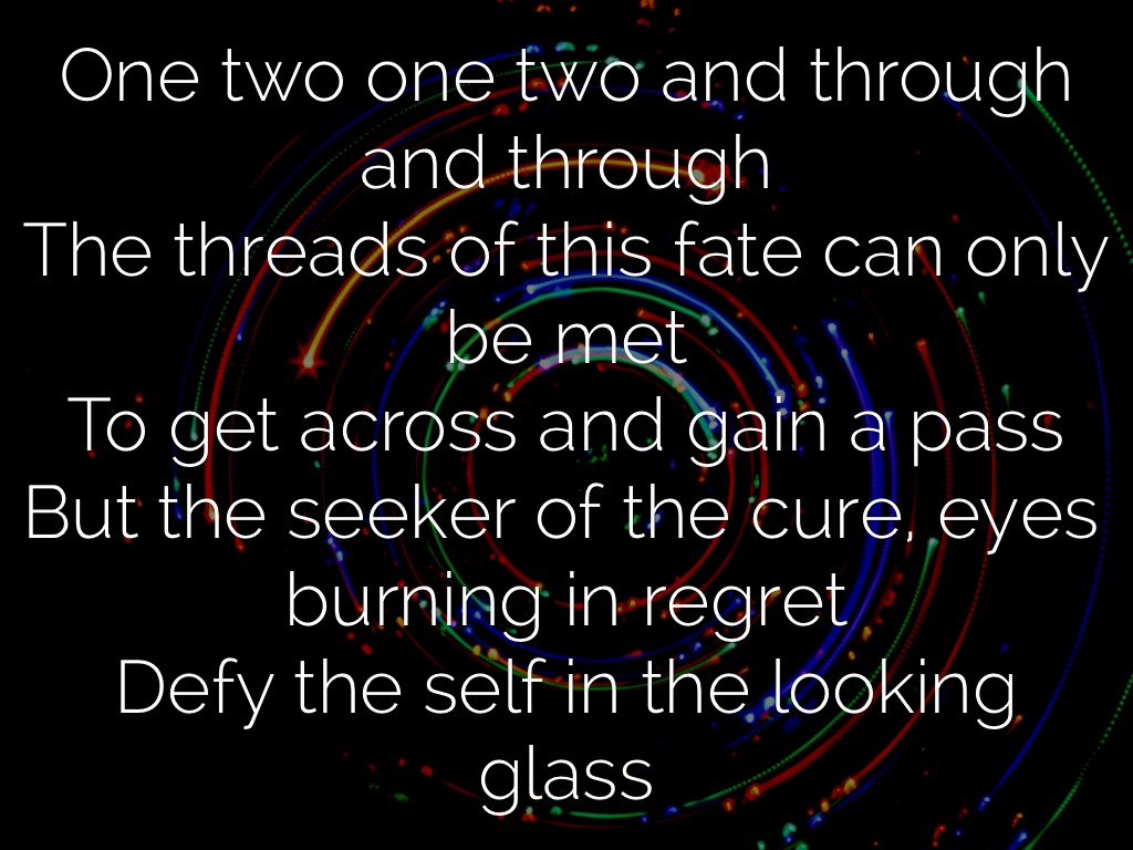 One two one two and through and through The threads of this fate can only be met To get across and gain a pass But the seeker of the cure, eyes burning in regret Defy the self in the looking glass