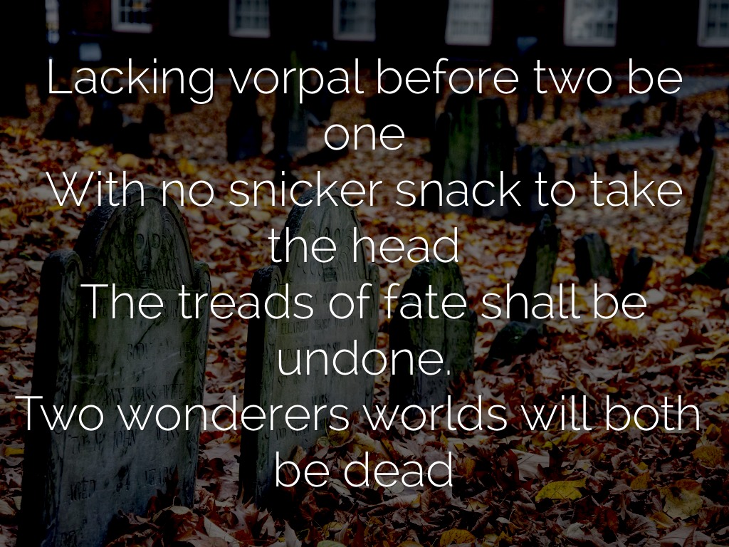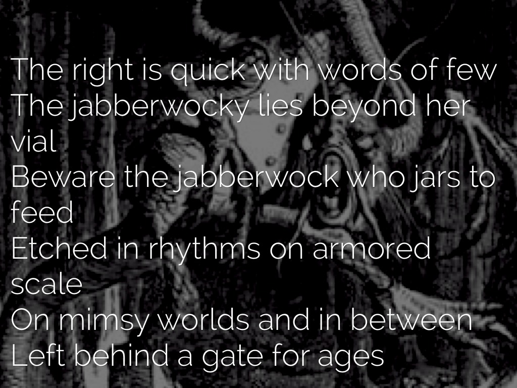 The right is quick with words of few The jabberwocky lies beyond her vial Beware the jabberwock who jars to feed Etched in rhythms on armored scale On mimsy worlds and in between Left behind a gate for ages