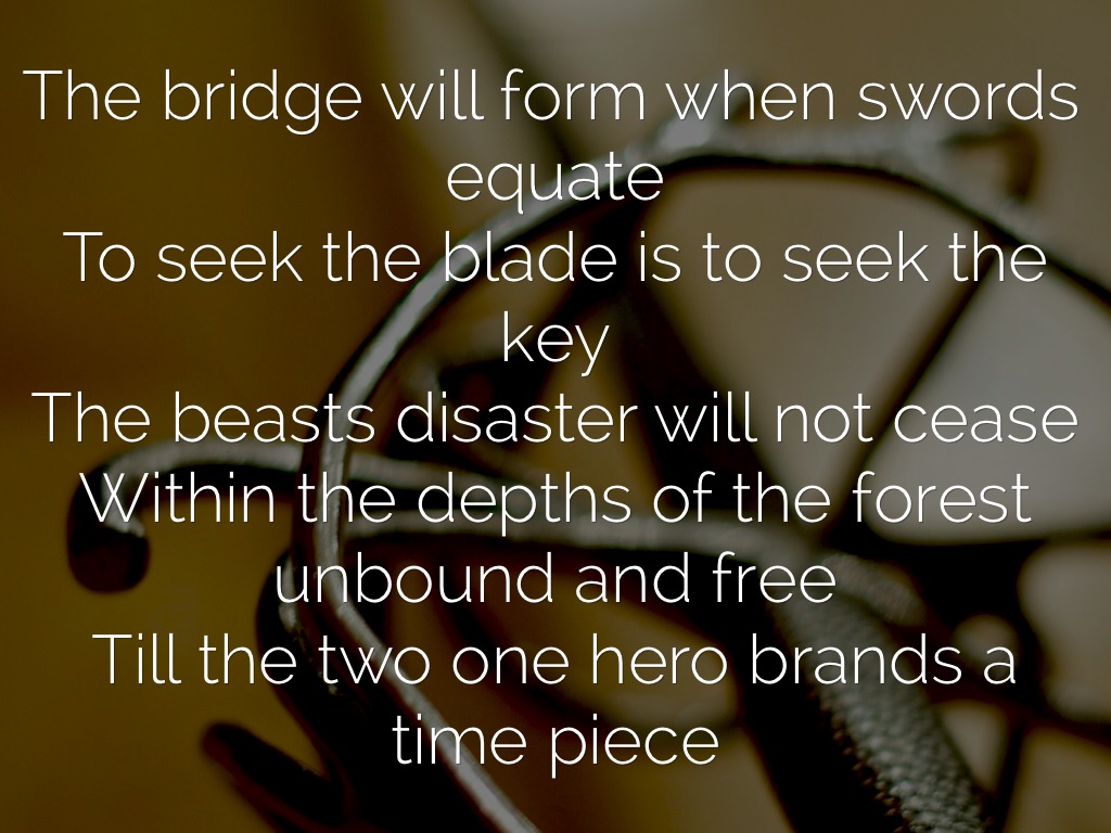 The bridge will form when swords equate To seek the blade is to seek the key The beasts disaster will not cease Within the depths of the forest unbound and free Till the two one hero brands a time piece