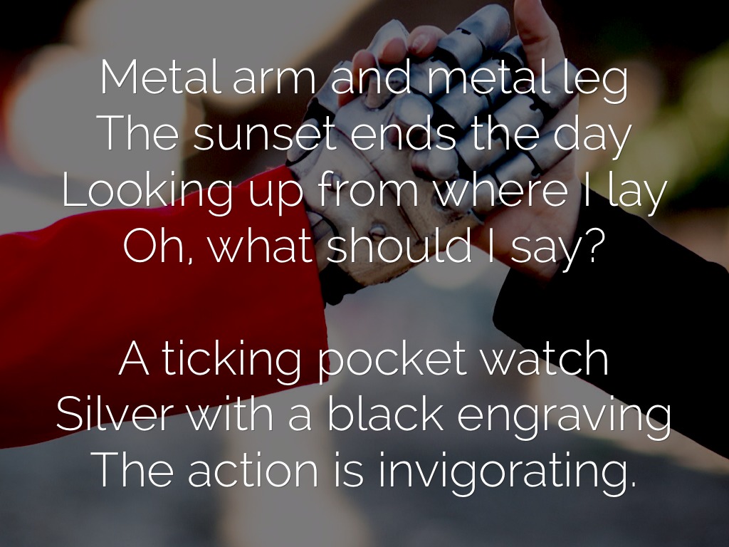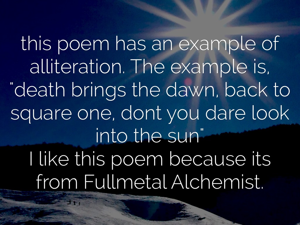 this poem has an example of alliteration. The example is, "death brings the dawn, back to square one, dont you dare look into the sun" I like this poem because its from Fullmetal Alchemist.