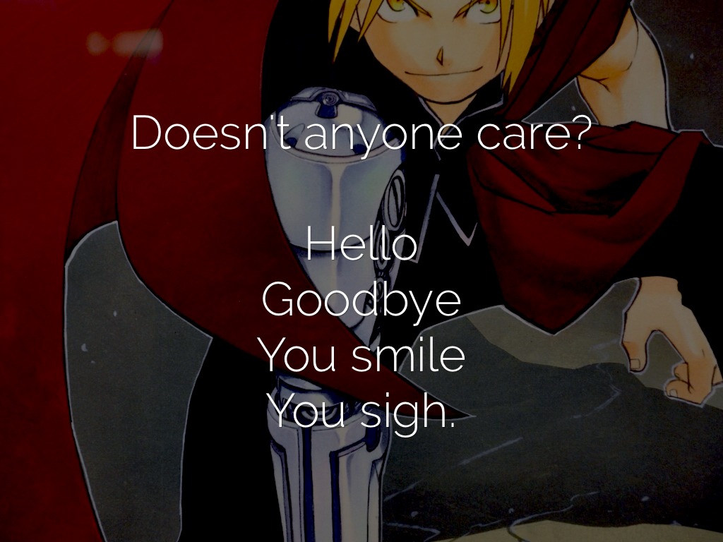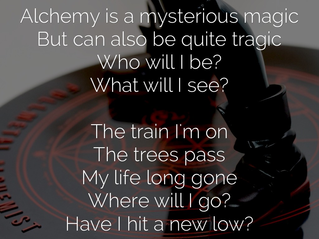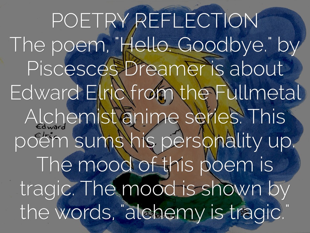 POETRY REFLECTION The poem, "Hello. Goodbye." by Piscesces Dreamer is about Edward Elric from the Fullmetal Alchemist anime series. This poem sums his personality up. The mood of this poem is tragic. The mood is shown by the words, "alchemy is tragic."