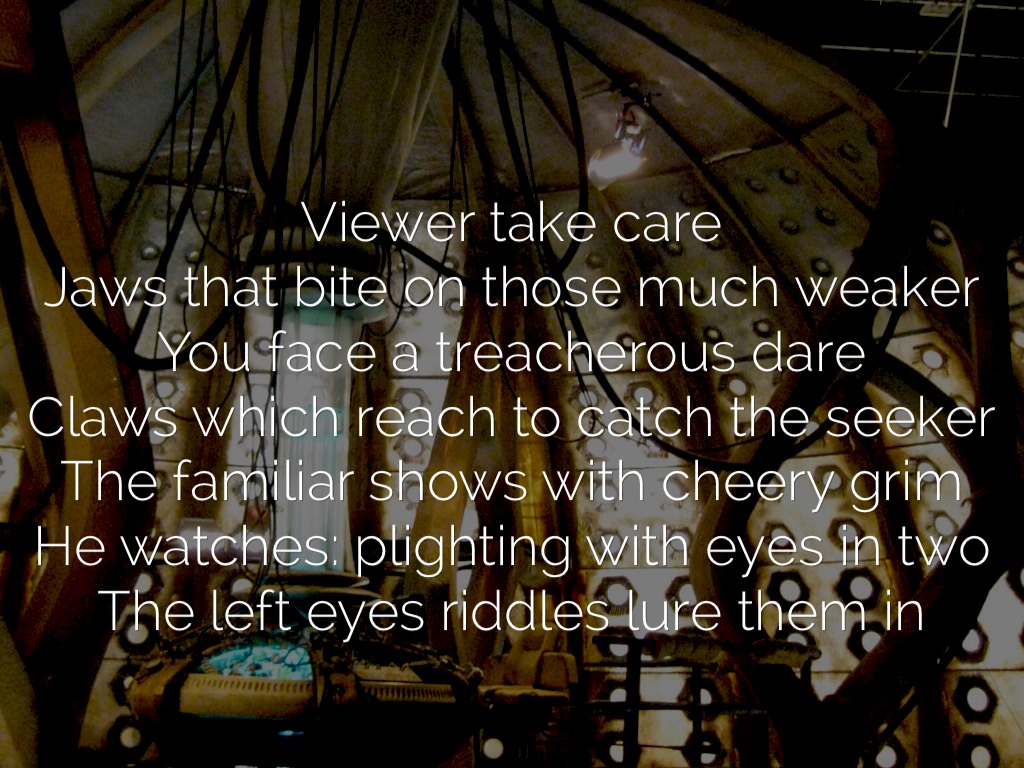 Viewer take care Jaws that bite on those much weaker You face a treacherous dare Claws which reach to catch the seeker The familiar shows with cheery grim He watches: plighting with eyes in two The left eyes riddles lure them in