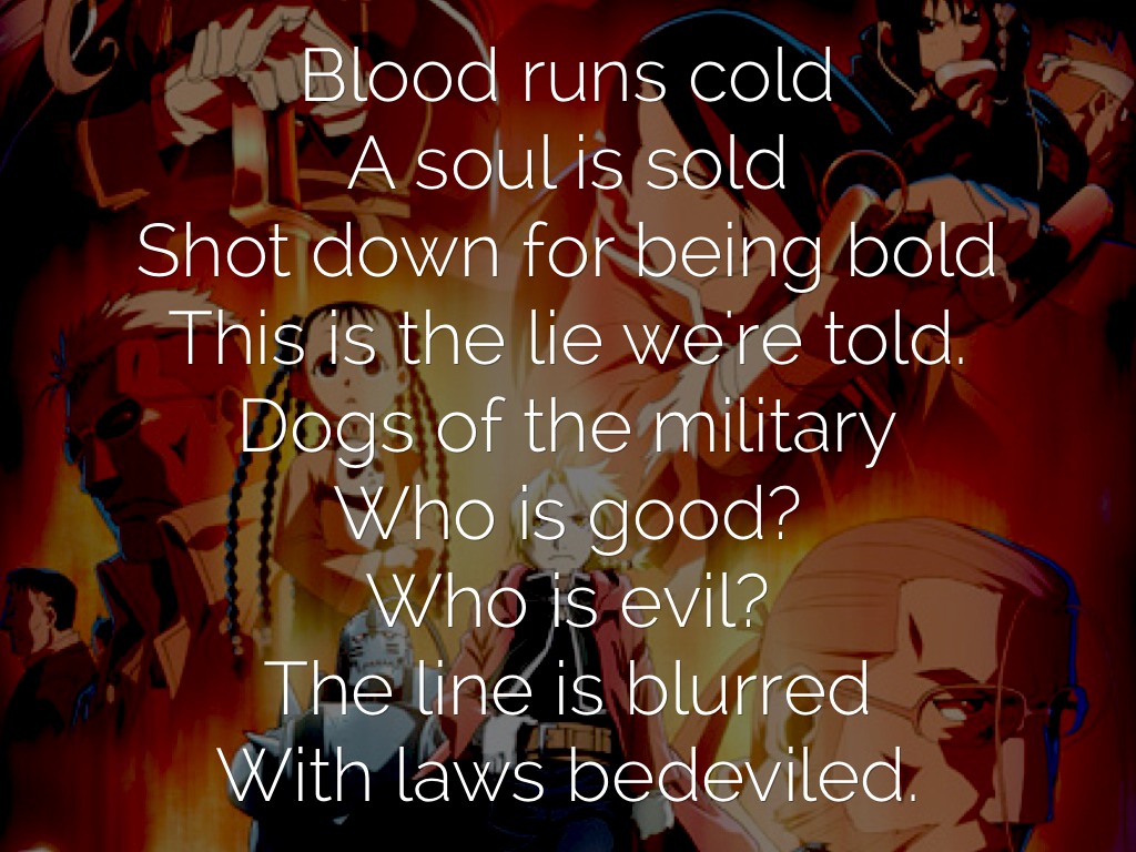 Blood runs cold A soul is sold Shot down for being bold This is the lie we're told. Dogs of the military Who is good? Who is evil? The line is blurred With laws bedeviled.