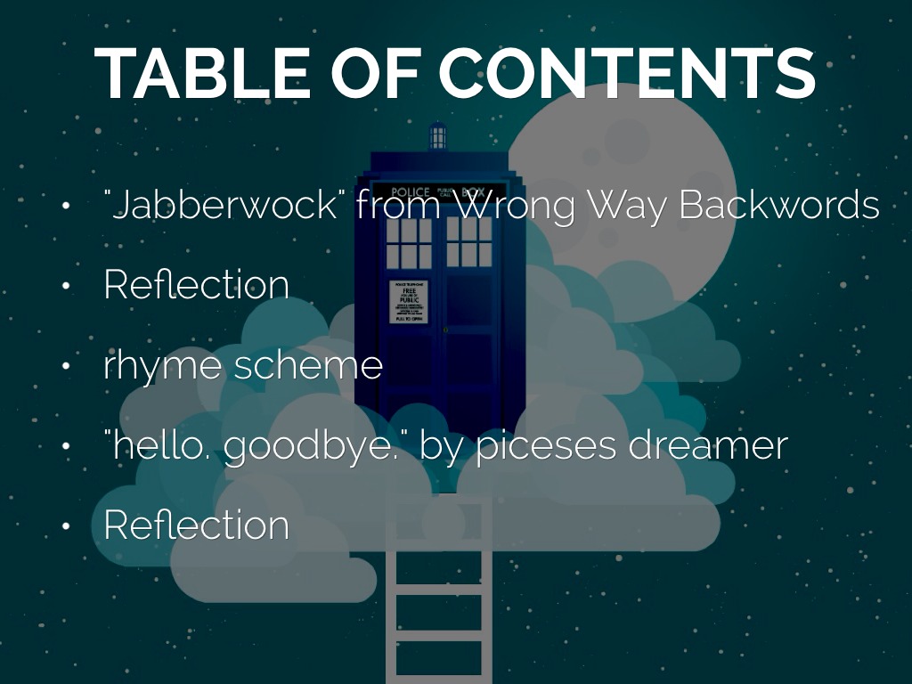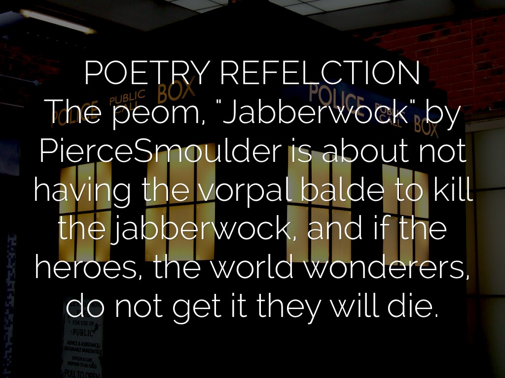 POETRY REFELCTION The peom, "Jabberwock" by PierceSmoulder is about not having the vorpal balde to kill the jabberwock, and if the heroes, the world wonderers, do not get it they will die.