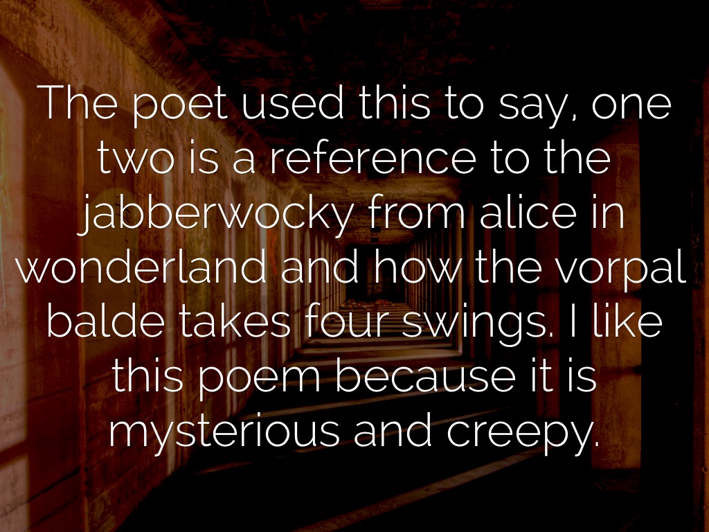 The poet used this to say, one two is a reference to the jabberwocky from alice in wonderland and how the vorpal balde takes four swings. I like this poem because it is mysterious and creepy.