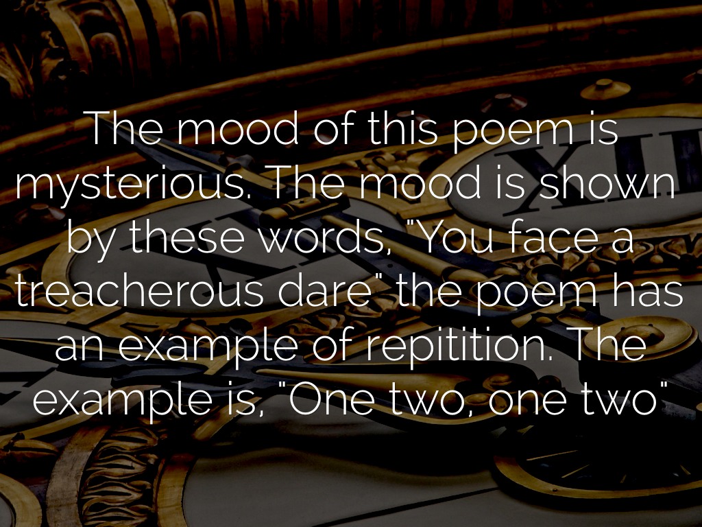 The mood of this poem is mysterious. The mood is shown by these words, "You face a treacherous dare" the poem has an example of repitition. The example is, "One two, one two"
