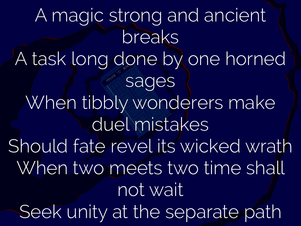 A magic strong and ancient breaks A task long done by one horned sages When tibbly wonderers make duel mistakes Should fate revel its wicked wrath When two meets two time shall not wait Seek unity at the separate path
