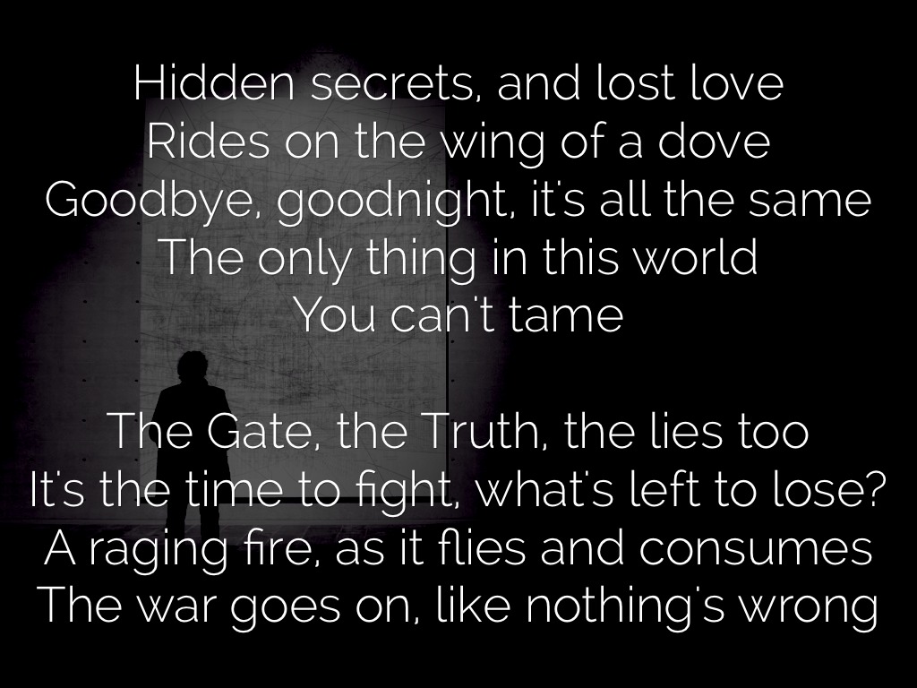 The Gate, the Truth, the lies too It's the time to fight, what's left to lose? A raging fire, as it flies and consumes The war goes on, like nothing's wrong