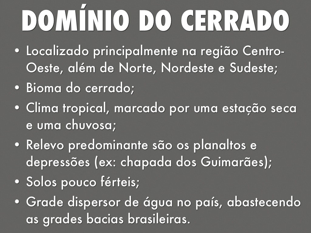 Relevo predominante são os planaltos e depressões (ex: chapada dos Guimarães);