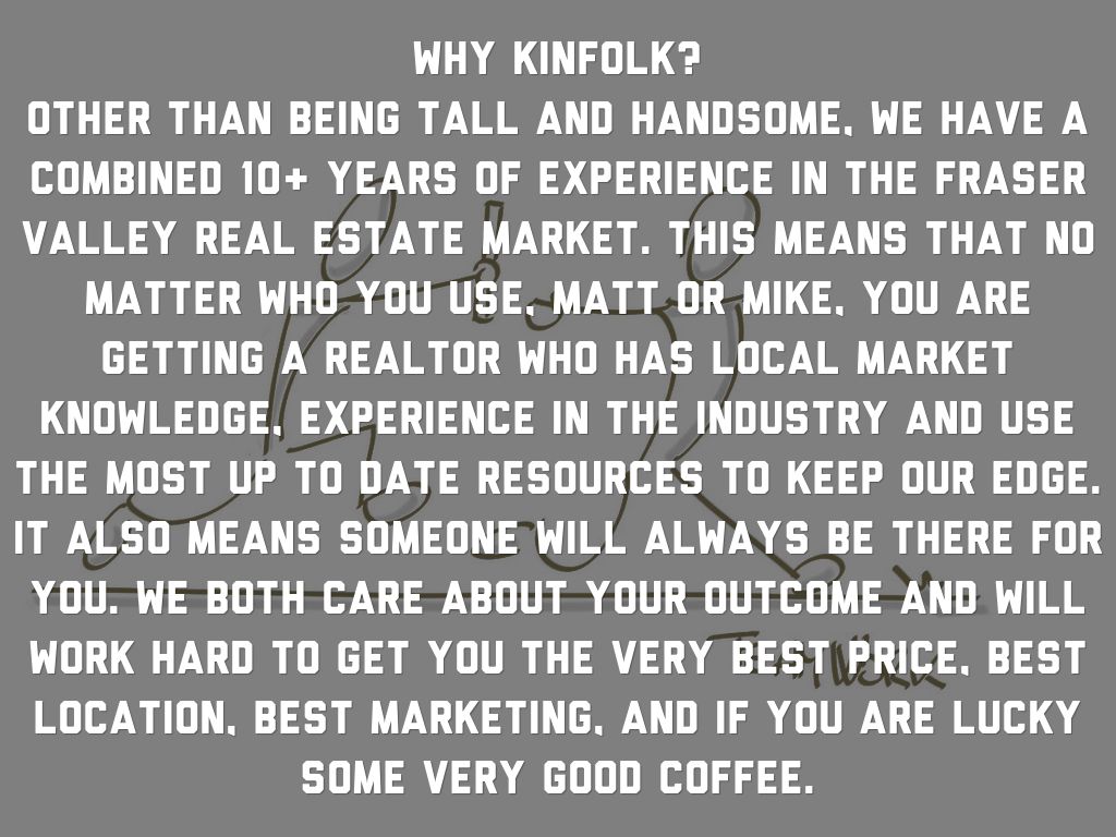 Why Kinfolk? Other than being tall and handsome, we have a combined 10+ years of experience in the Fraser Valley real estate market. This means that no matter who you use, Matt or Mike, you are getting a realtor who has local market knowledge, experience in the industry and use the most up to date resources to keep our edge. It also means someone will always be there for you. We both care about your outcome and will work hard to get you the very best price, best location, best marketing, and if you are lucky some very good coffee.