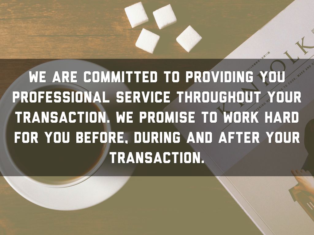 We are committed to providing you professional service throughout your transaction. We promise to work hard for you before, during and after your transaction.