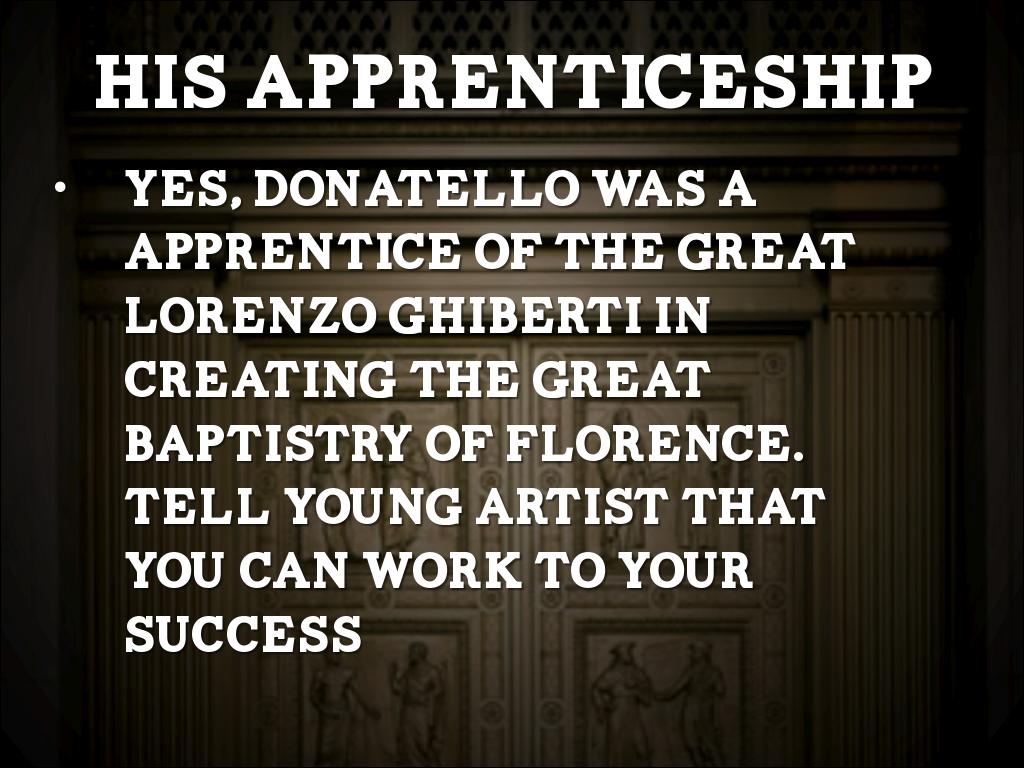 YES, DONATELLO WAS A APPRENTICE OF THE GREAT LORENZO GHIBERTI in creating the great Baptistry of Florence. Tell young artist that you can work to your success