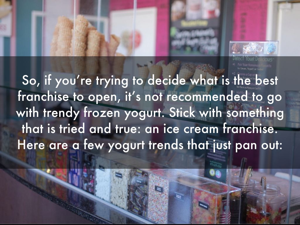 So, if you’re trying to decide what is the best franchise to open, it’s not recommended to go with trendy frozen yogurt. Stick with something that is tried and true: an ice cream franchise. Here are a few yogurt trends that just pan out: