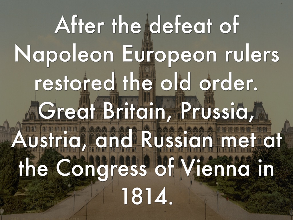 After the defeat of Napoleon Europeon rulers restored the old order. Great Britain, Prussia, Austria, and Russian met at the Congress of Vienna in 1814.