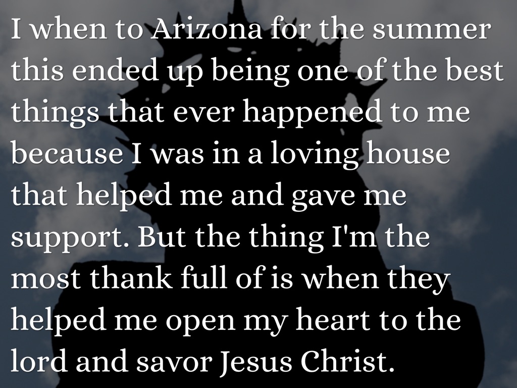 I when to Arizona for the summer this ended up being one of the best things that ever happened to me because I was in a loving house that helped me and gave me support. But the thing I'm the most thank full of is when they helped me open my heart to the lord and savor Jesus Christ.